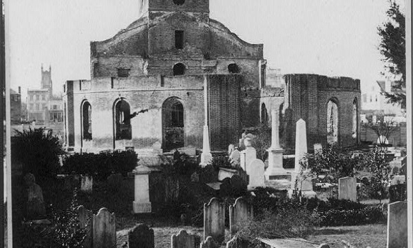 Some interesting building casualties: The Circular Congregational Church. (I say interesting because there wasn’t a huge Congregational presence in the South, but my historical New Englander John Thomas is a Congregationalist.) The church was rebuilt and claims with pride to be one of the oldest continuously worshipping congregations in the South. It was founded in 1688. You can see its ruins here in a period photograph. The graveyard in the foreground is rather eerie.
