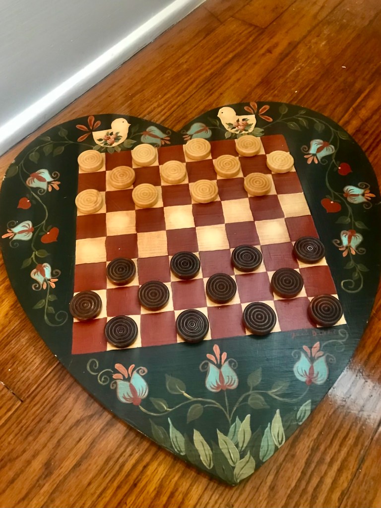 So between Hulu and the HGTV app, I watched all of the seasons and was even inspired for a few things in my house! In the South, we have a great tradition of making something out of what we have. One might almost say we thrive in limited circumstances where a touch of innovation can bring about remarkable effects. For instance, Erin, discovering that a basket light would cost hundreds of dollars, bought a five-dollar light kit and a big old basket and made one herself. As for me, that made my wheels start spinning. I have a room in my house for my nieces and nephew that is inspired by old nurseries of historic houses. I was wanting a checkerboard for them to play with when they get older. Walking through an antique store, I found a wooden wall hanging featuring a very unique design with a checkerboard and bought it for about eight dollars. At home, I popped the hanging kit out of the back, bought a set of wooden checkers from Amazon, and voila! Here is my creation: