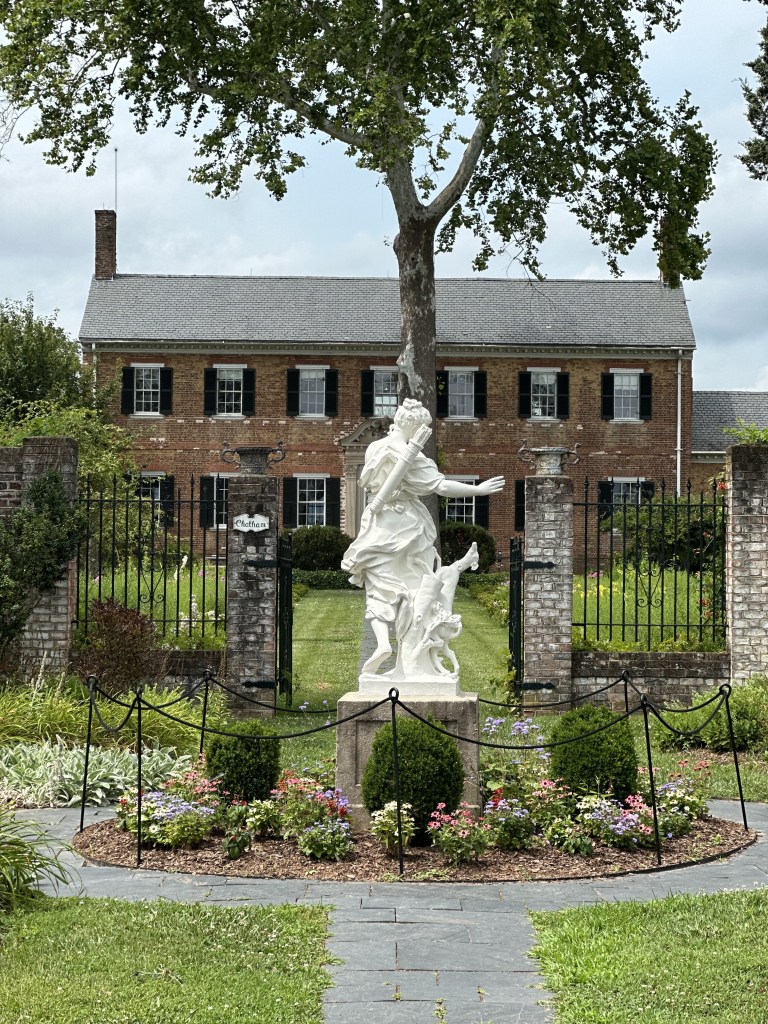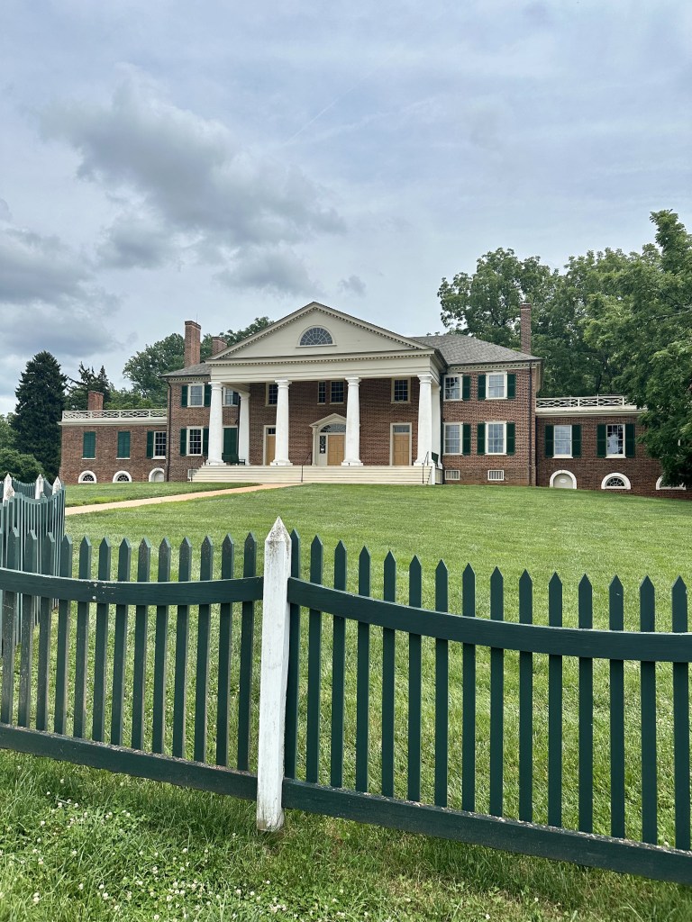 Montpelier is in Orange, VA, and by the time you get there, the terrain looks a little different, less mountainous, more prosperous for farming. Madison came from a wealthier family than Jefferson, so everything felt a bit differently. For one, the house, being older, was my first experience of a house that was similar in architectural style to the one I had depicted in Secrets. It is rectangular, and as you walk in, there is immediately a long hall. We would see this style repeated on the trip. It is a design style that, while large and, to our eyes, grand, was intended by builders during colonial times to make the best usage of square footage.